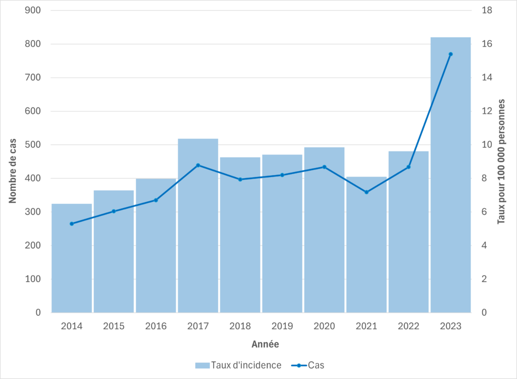 Figure 8. Cas de SGAi et taux d’incidence pour 100 000 habitants en Ontario, 2014-2023