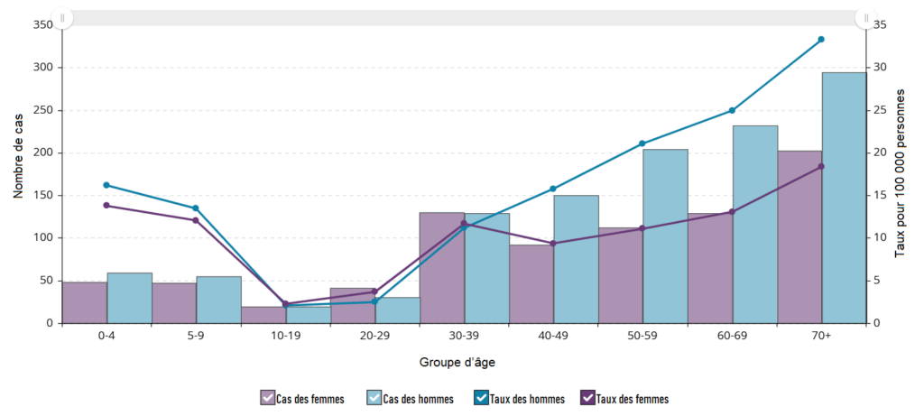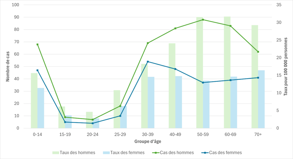 Figure 9. Cas de SGAi et taux d’incidence pour 100 000 habitants en Ontario, par groupe d’âge et par sexe, 2023