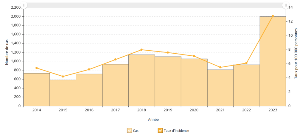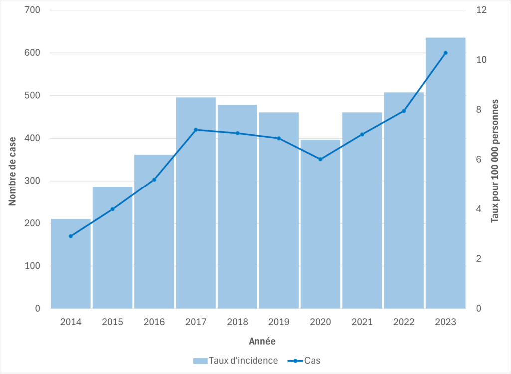 Figure 4. Cas de SGAi et taux d’incidence pour 100 000 habitants en Alberta, 2014-2023