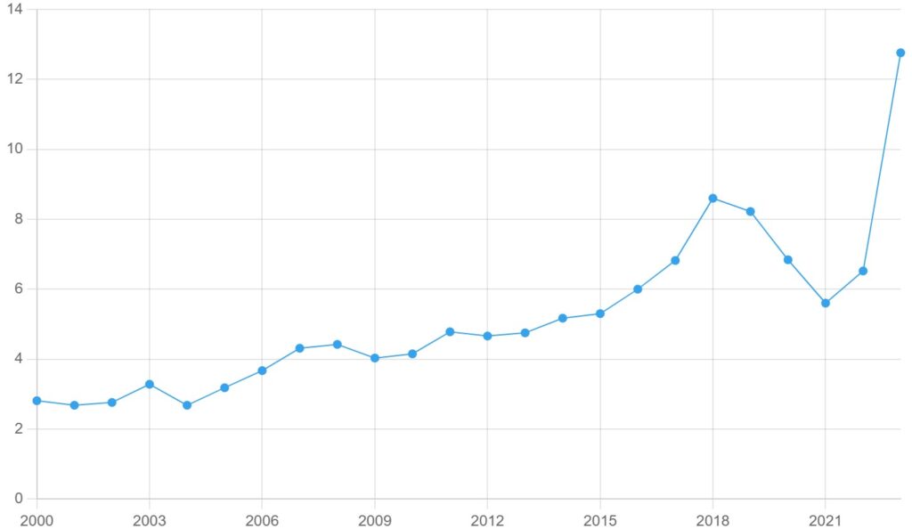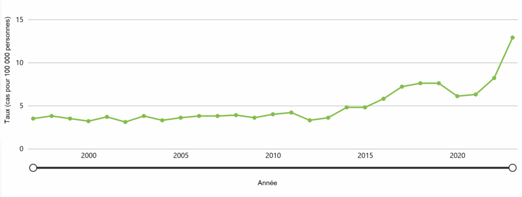 Le nombre moyen de cas de SGAi a augmenté aux États-Unis au cours de la dernière décennie, les données de 2023 indiquant un pic sur 20 ans du nombre d’infections graves causées par le SGAi. En 2023, les États-Unis ont signalé 43 100 cas de SGAi (12,9 cas pour 100 000 habitants).