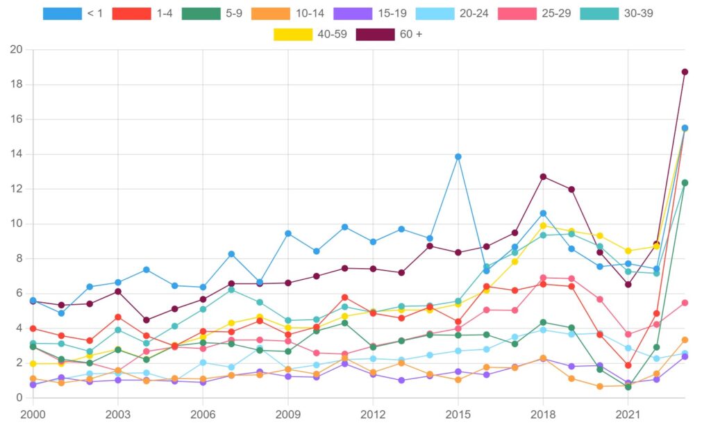Figure 11. Taux pour 100 000 cas signalés de SGAi aux États-Unis entre 1997 et 2023