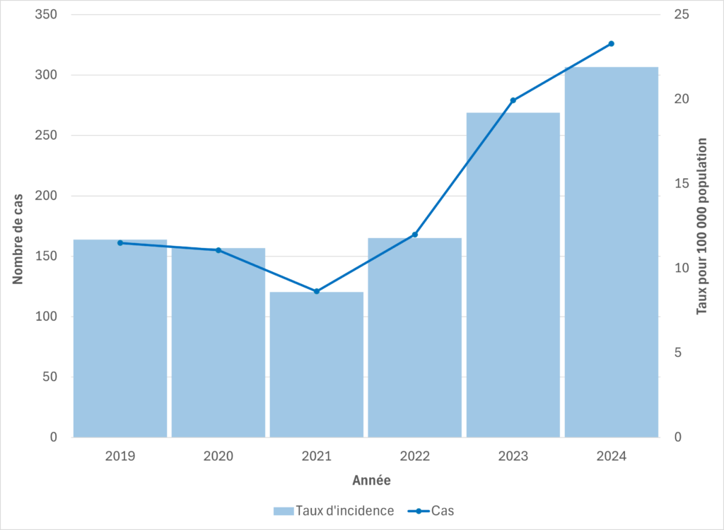 Figure 3. Cas de SGAi et taux d’incidence pour 100 000 habitants au Manitoba, 2019-2024