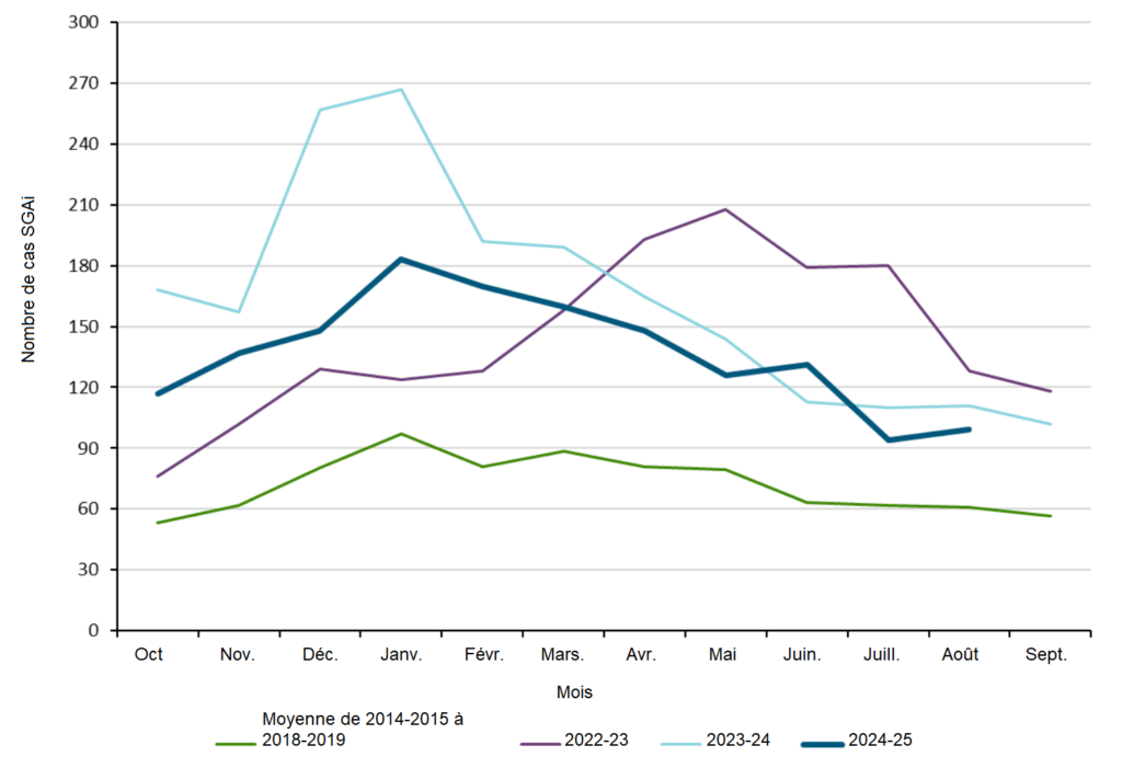 En Ontario, le nombre de cas de SGAi et le taux d’incidence signalés entre le 1er octobre 2024 et le 30 août 2025 ont été en moyenne inférieurs à ceux de la saison 2023-2024. Toutefois, le nombre total de cas pour la période 2024-2025 était supérieur à la moyenne des cinq saisons prépandémiques (figure 10).