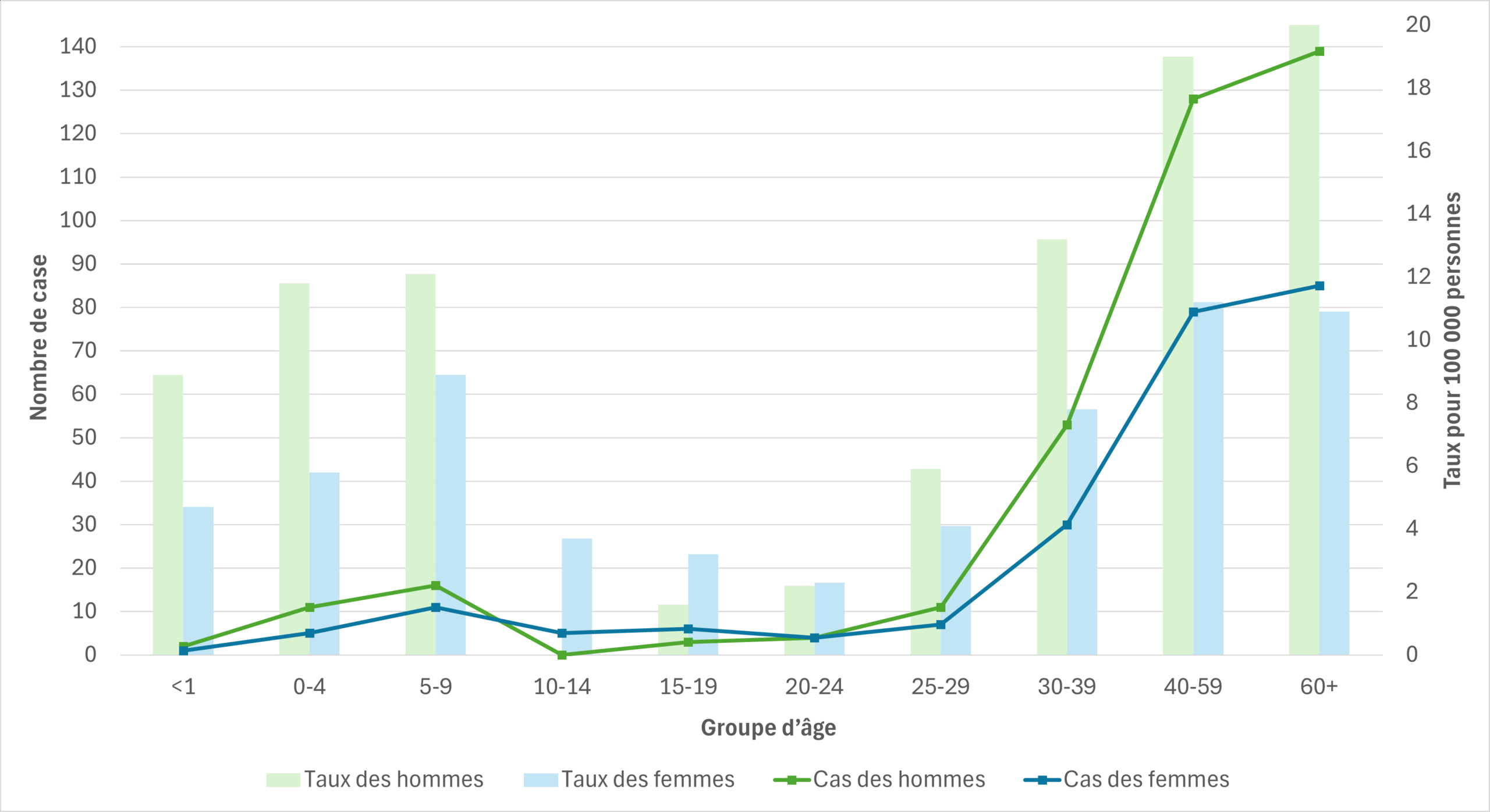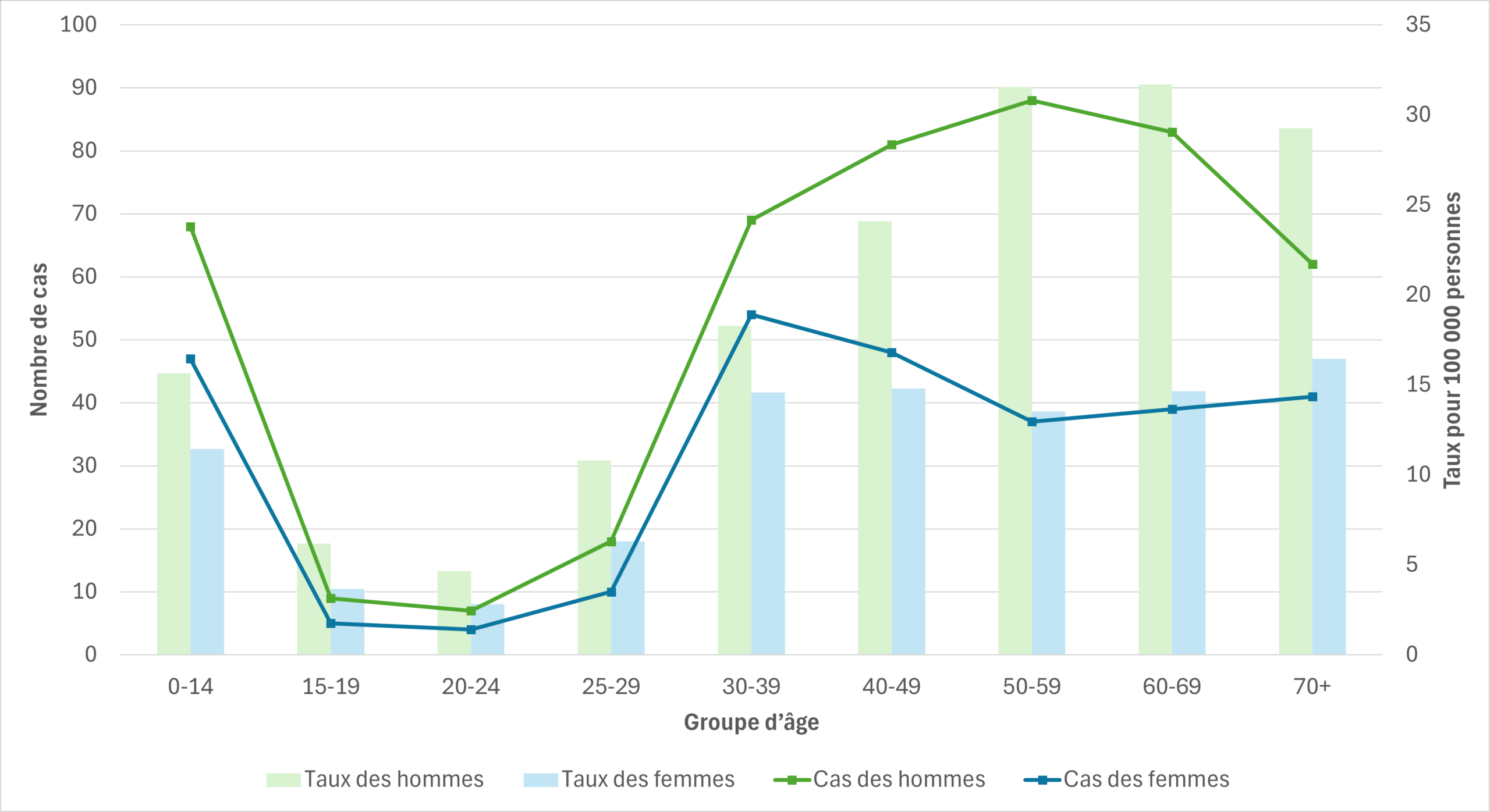 Figure 9. Cas de SGAi et taux d’incidence pour 100 000 habitants en Ontario, par groupe d’âge et par sexe, 2023