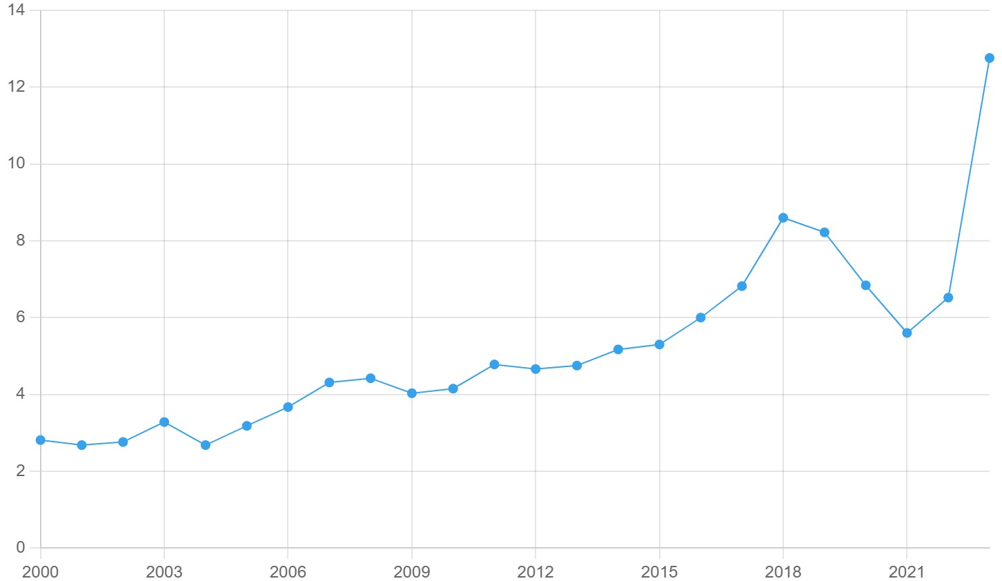 Le nombre moyen de cas de SGAi a augmenté aux États-Unis au cours de la dernière décennie, les données de 2023 indiquant un pic sur 20 ans du nombre d’infections graves causées par le SGAi. En 2023, les États-Unis ont signalé 43 100 cas de SGAi (12,9 cas pour 100 000 habitants).