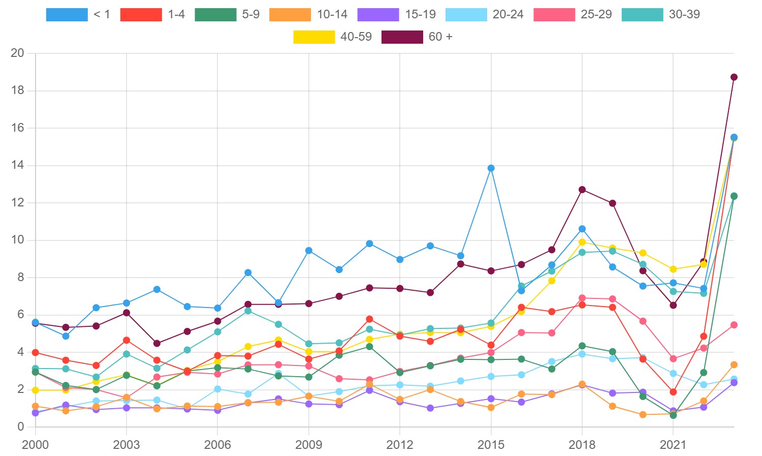 Figure 11. Taux pour 100 000 cas signalés de SGAi aux États-Unis entre 1997 et 2023