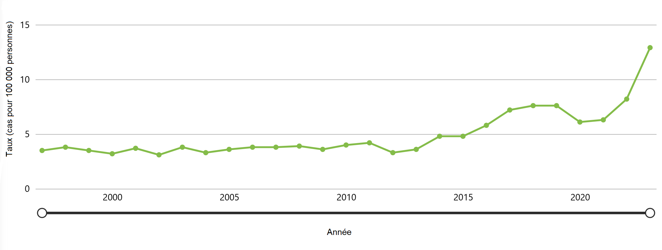 Les points saillants sur les maladies du CCNMI fournissent aux cliniciens et aux praticiens de la santé publique du Canada des analyses à jour des données essentielles sur les maladies infectieuses les plus importantes pour la pratique de la santé publique au pays. Bien qu’il ne s’agisse pas d’un examen exhaustif de la documentation, les informations sont recueillies auprès de sources clés, notamment l’Agence de la santé publique du Canada (ASPC), les Centers for Disease Control and Prevention (CDC) des États-Unis, l’Organisation mondiale de la santé (OMS) et dans des documents évalués par les pairs.