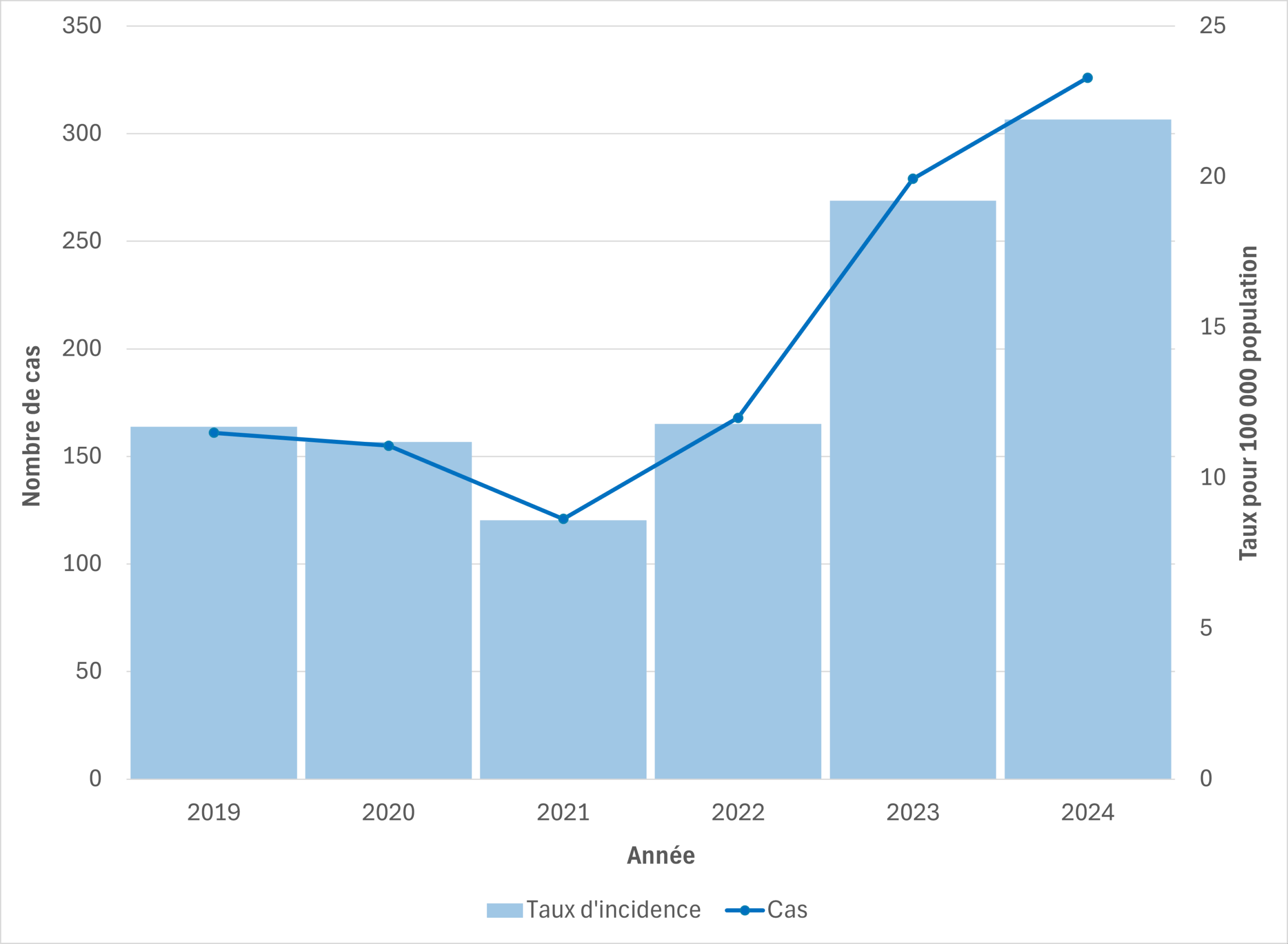 Figure 3. Cas de SGAi et taux d’incidence pour 100 000 habitants au Manitoba, 2019-2024